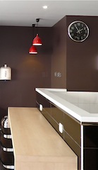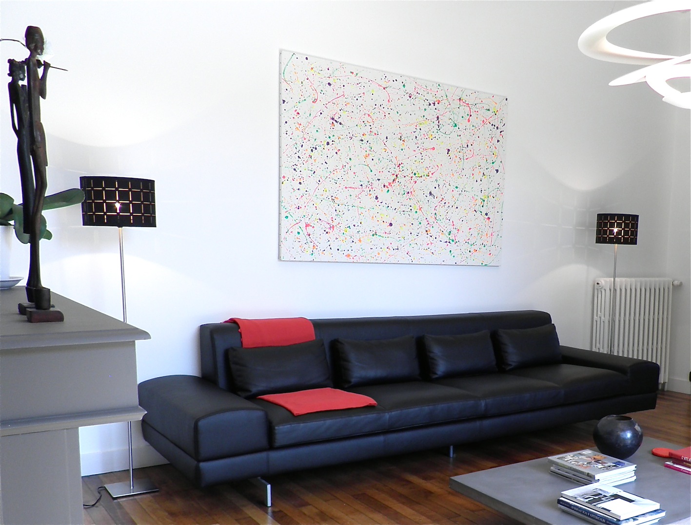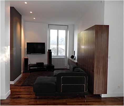 Ici, dans l’élaboration et la création de l'aménagement de cette maison de ville (à suivre photos après chantier), nous avons décidé de créer un meuble sur mesure « en suspension » pour éviter, autant que possible, un effet masse du fait des dimensions de ce dernier et animant la circulation des perspectives ainsi créées.