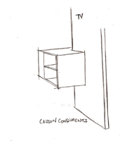 Ici, l'intérêt de ce meuble suspendu permettra d'avoir une partie accessible pour du rangement coté salon tv et de l'autre coté du mur, une autre partie du meuble, servira de vestiaire - petit couloir donnant face à l'entrée.