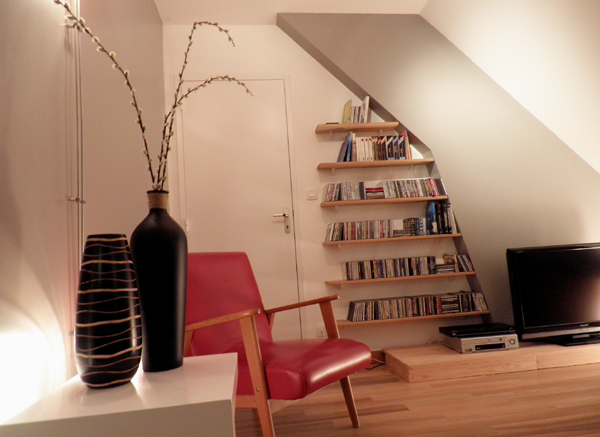 Un matelas habillé et coussins entreposés serviront d'assises, face à la TV - plutôt qu'un canapé - permettant d'exploiter toute la surface sous pente de la mezzanine et accentuant son coté cosy.
