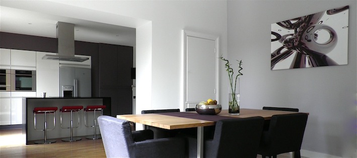 L'ouverture entre la cuisine et la salle à manger a été agrandie afin d'aérer les perspectives et faciliter l'ergonomie de circulation.