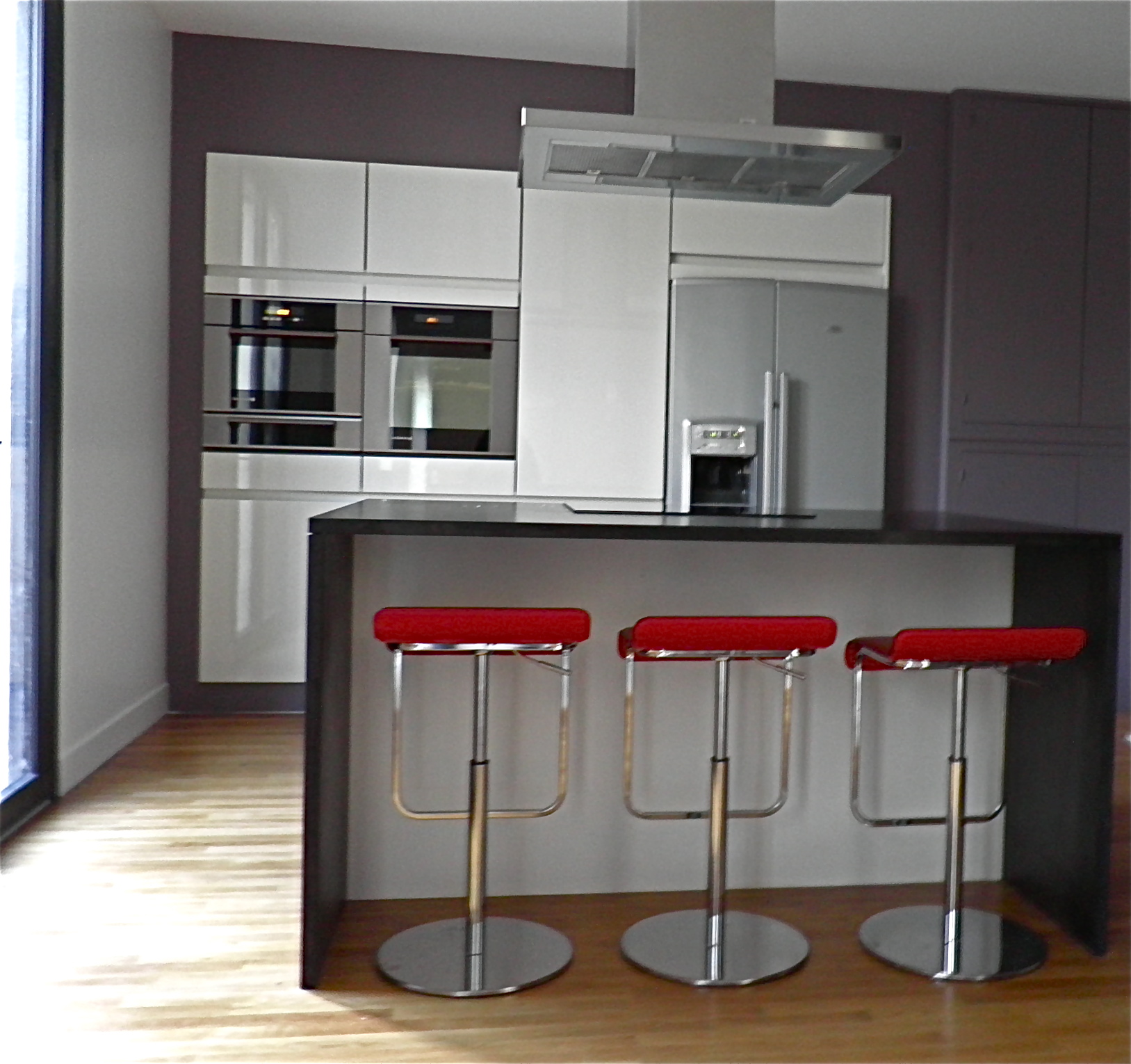 ( 3 / 392 )Conception et design d'une cuisine contemporaine, en collaboration avec le cuisiniste et les heureux propriétaires. L'ilot central représentait le point de départ - permettant une circulation et une utilisation de l'espace sans en altérer son esthétique général. Dans cette configuration le choix des tabourets de couleur vive s'imposait pour réveiller l'ensemble, ainsi qu'une couleur de fond appliquée au mur mettant en avant les meubles de cuisine.