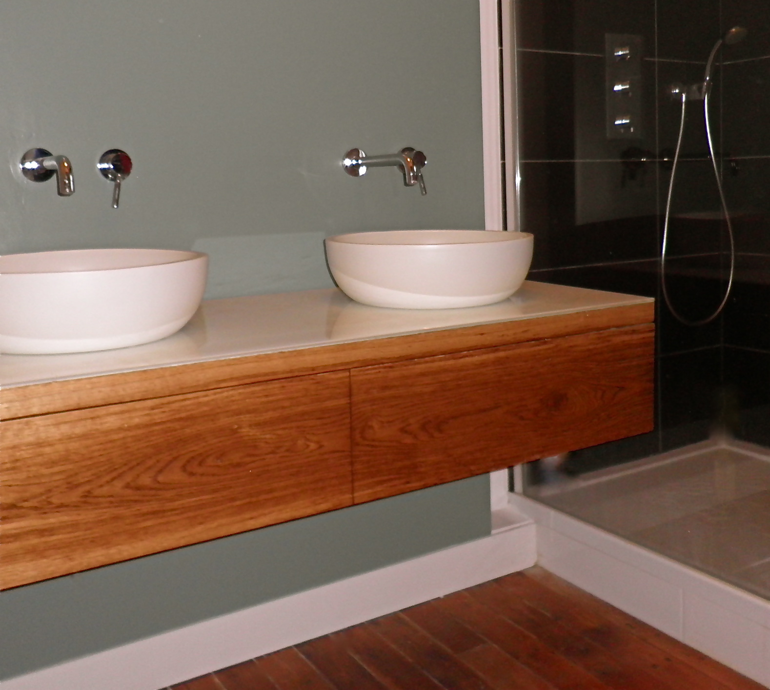 ( 3 / 542 )Design simple et efficace pour cette salle de bain, avec son meuble suspendu dessiné et conçu sur mesure. Simplicité marquée par sa ligne épurée, 2 tiroirs sans poignées apparentes (goulotte rainurée en extrémité basse des tiroirs pour un accès ergonomique). Travail effectué en collaboration avec le menuisier pour relever le veinage du bois massif (chêne) avec des jeux de teintes afin d'obtenir cette configuration visuelle.